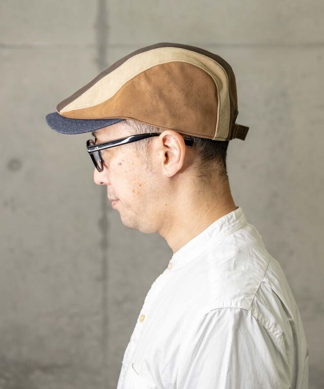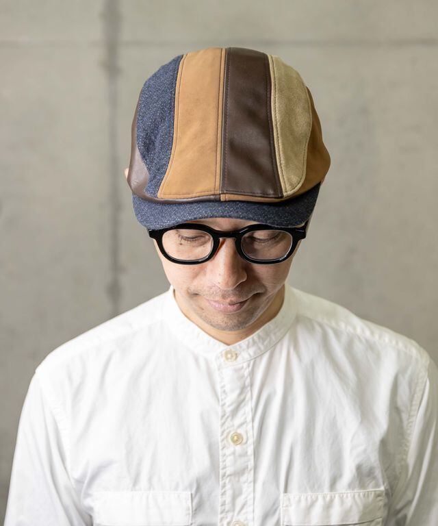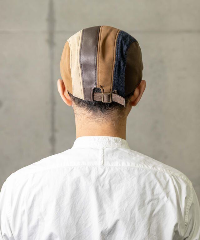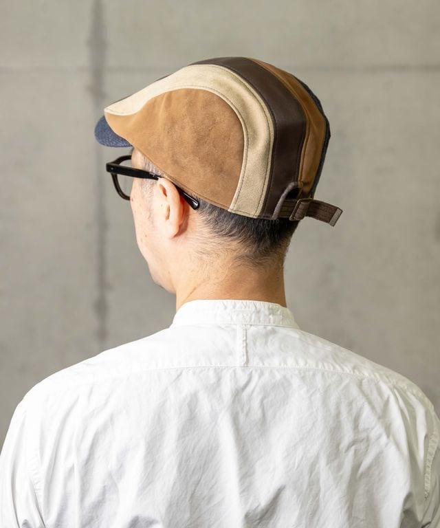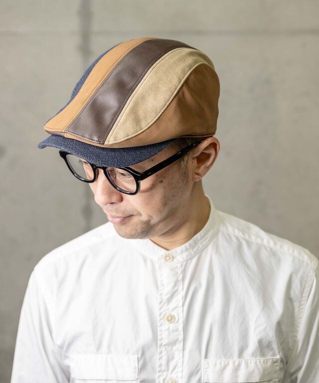 デニム、レザー、スウェード風の異素材パッチワークハンチングです。