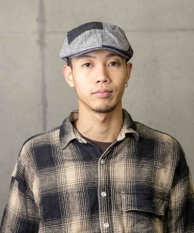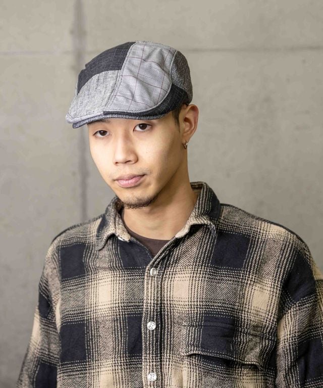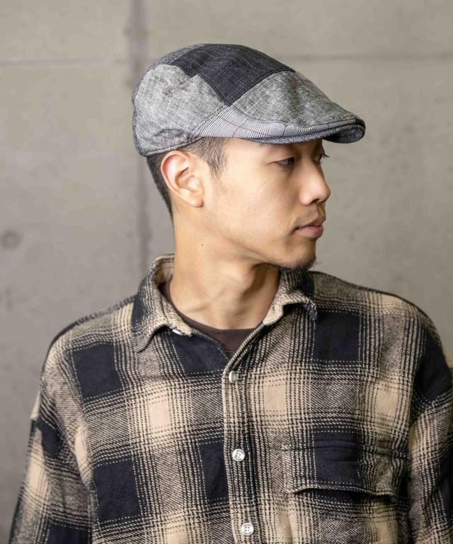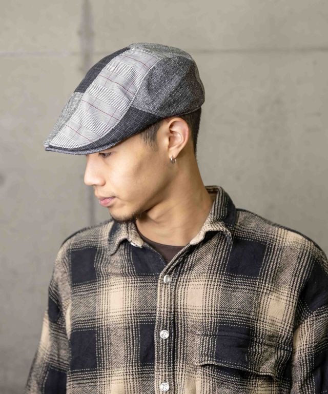 グレンチェックと異素材パッチワークを組み合わせたハンチング。